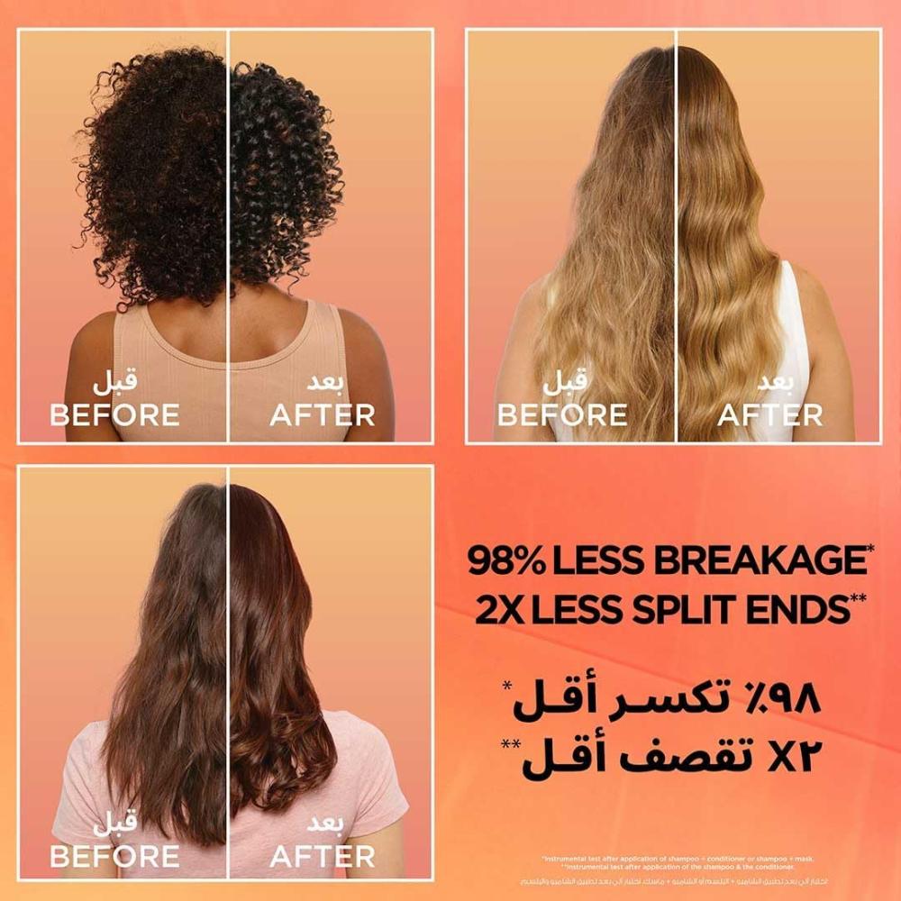 - يقلّل من التكسر ويقوي الأطراف: يحتوي المستحضر على مستخلص الأناناس الغني بفيتامين C وحمض ألفا‑هيدروكسي، إضافة إلى زيت جوز الهند وزبدة الشيا اللذين يغذيان البُصَيلات ويقويان ألياف الشعر.